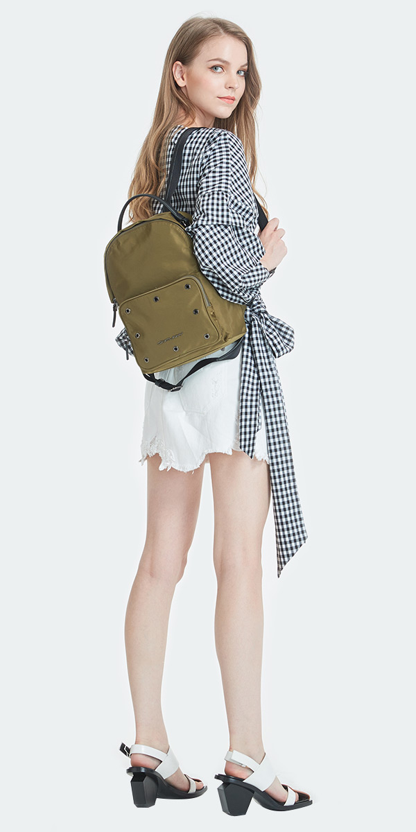 这两年一直走在时尚前端的军绿色,我们也不错过。从搭配上体现自我风格。双肩包,铆钉装饰,大手挽。